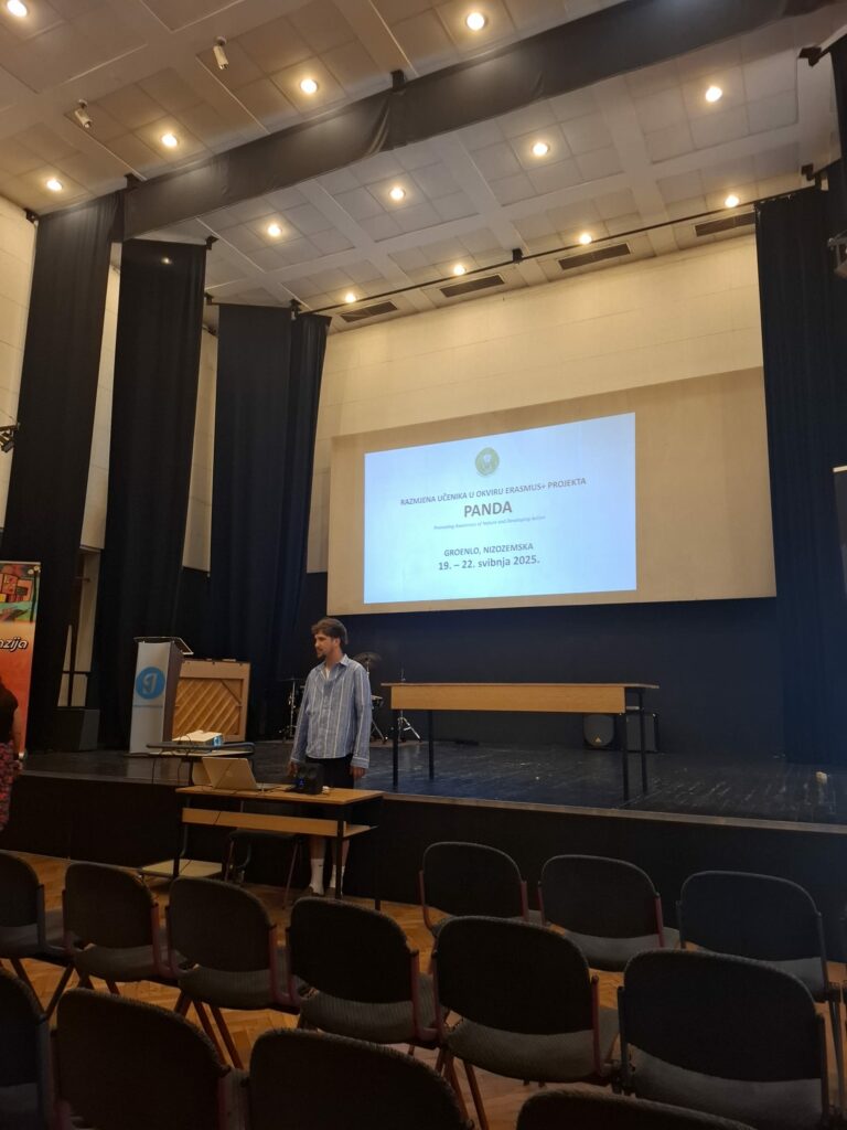 Na Nastavničkom vijeću održanom 4. srpnja 2025. godine, nastavnik Dragan Rašić održao je diseminaciju projektnih Erasmus+ aktivnosti u sklopu projekta PANDA. U razdoblju od 17. – 22. svibnja 2025. g., dvanaest učenika Prve gimnazije (Anja Martinović, Lucija Zajec, Anika Radoš, Ena Lucija Živković, Matija Kadović, Aleta Maligec, Iva Hozmec, Borko Novak, Hrvoje Boroje, Lovro Mikulčić, Stjepan Šalinović i Relja Alčevski) sudjelovali su u nastavku projekta PANDA (Promoting Awareness of Nature and Developing Action) koji se odvijao u gradu Groenlo, Nizozemska. Grupa učenika i profesora iz gradića Groenlo posjetila je Zagreb u listopadu 2024. i ovdje sudjelovala u aktivnostima koje su za njih pripremili naši učenici zajedno sa svojim mentorima (Dragan Rašić, prof., Luka Miholić, prof, Zlata Paštar, prof.), a sada se zagrebačka grupa uputila u posjet njihovoj školi i svakodnevici.